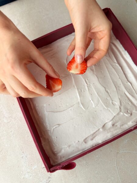 - Verrührt das Ísey Skyr Erdbeer-Limette Mousse mit dem Isey Skyr Natur. Verteilt die Skyr-Erdbeer-Mischung auf dem Boden darauf. Schneidet die Erdbeeren in ca. 05. cm dicke Scheiben und verteilt sie darauf. Lasst alles für mindestens 30 Minuten im Kühlschrank durchkühlen.
