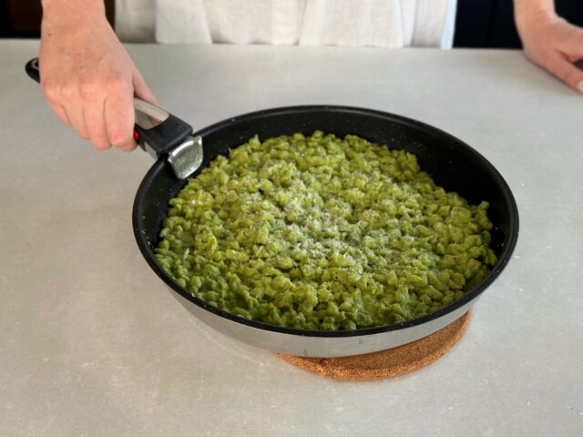 Der Teig ist schnell zusammengerührt, braucht nur eine kurze Ruhezeit und lässt sich dann ganz unkompliziert durchs Spätzlisieb streichen. Sobald die Spätzli an die Oberfläche steigen, ist der schwierigste Teil schon geschafft.
