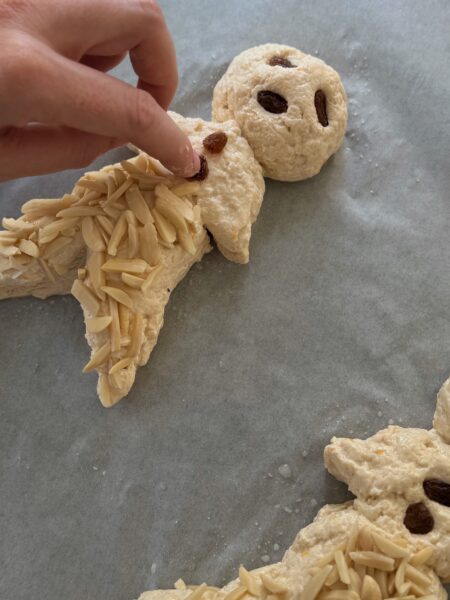 - Mit Rosinen oder Nüssen können Augen und Knöpfe aufgesetzt, mit einem Messer Mund und Verzierungen eingeschnitten werden. Hagelzucker und oder Mandeln auf den Grittibänzen verteilen.