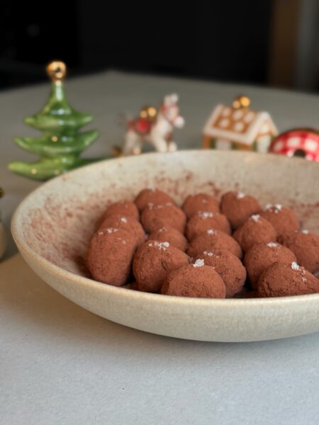 - Bällchen in Kakaopulver rollen und mit Meersalz bestreuen.