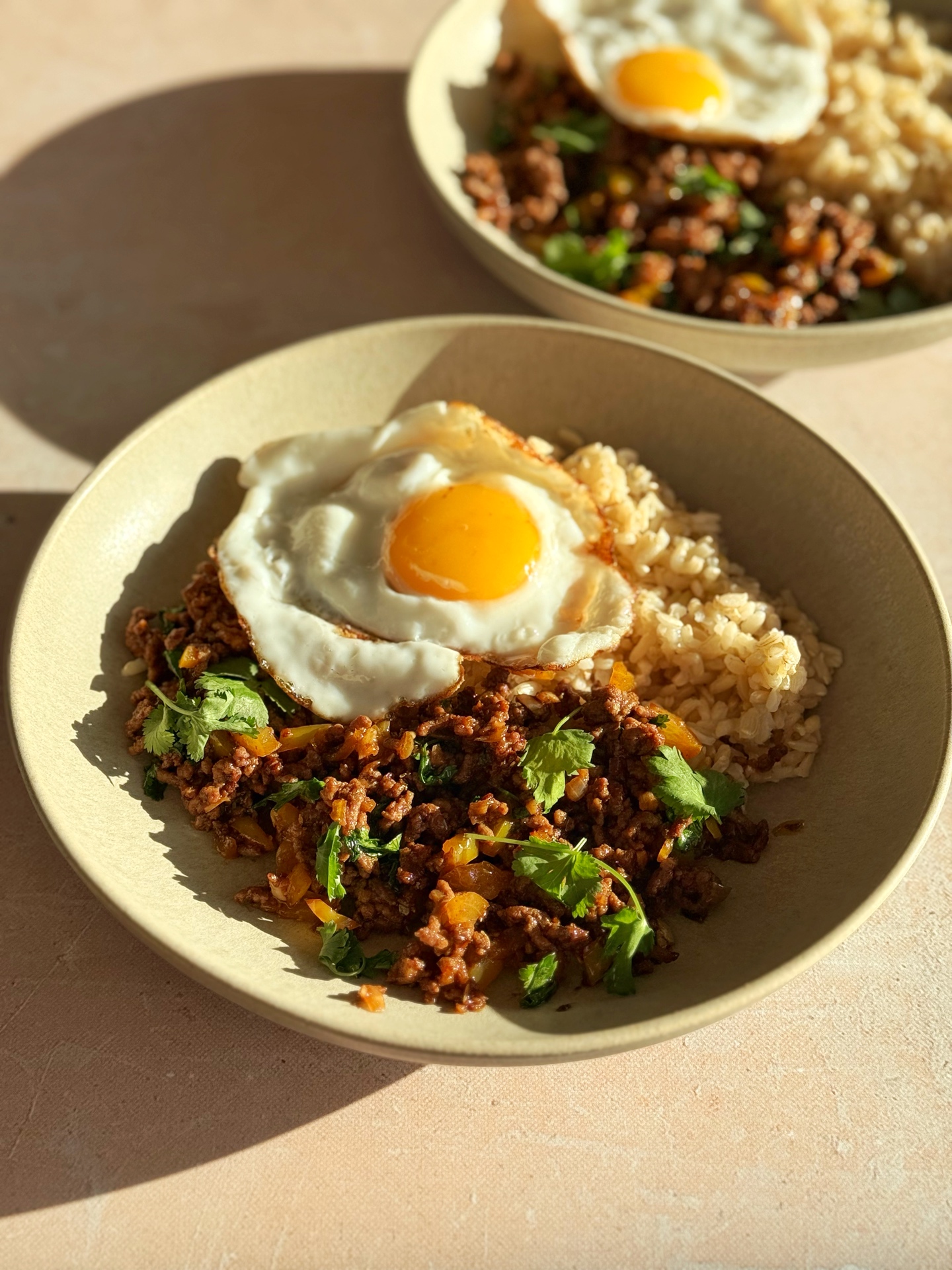 Serviere dein Pad Kra Pao heiss mit Reis und dem Spiegelei obenauf. Mmh, fein!