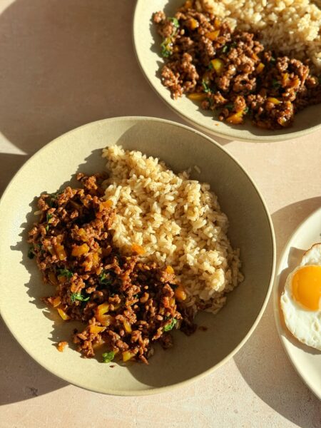Serviere dein Pad Kra Pao heiss mit Reis und dem Spiegelei obenauf. Mmh, fein!