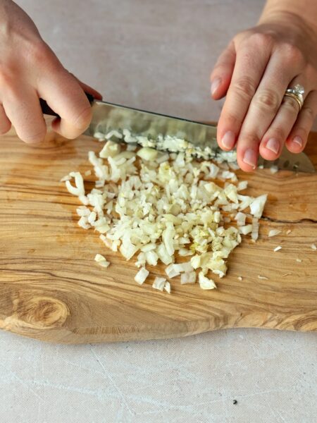 - Die Paprika und den Knoblauch klein schneiden.