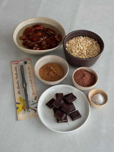 Zutaten, die Power liefern: Hafermehl, Datteln, Mandel‑ oder Erdnussmus, Kakao, Vanille.